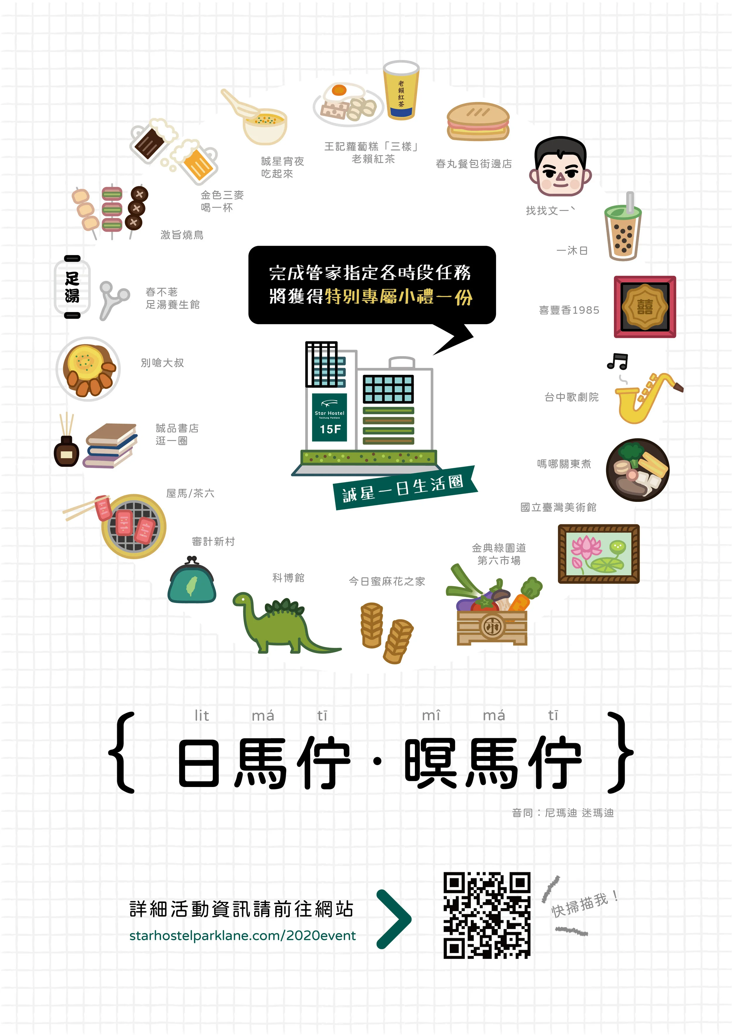 November 6, 2020 Guest User 誠星《日馬佇,瞑馬佇》活動開跑囉 November 6, 2020 Guest User 尼馬迪、迷馬迪-----唸下神奇的咒語後,你/妳任務即將展開。準備好進入誠星的一日生活圈,展開在你/妳台中的小旅行嗎?< Star Hostel新活動-日馬佇,瞑馬佇>在各項時段完成管家指定任務即可獲得專屬小禮一份🎁活動詳情請至:https://starhostelparklane.com/2020event/ Guest User