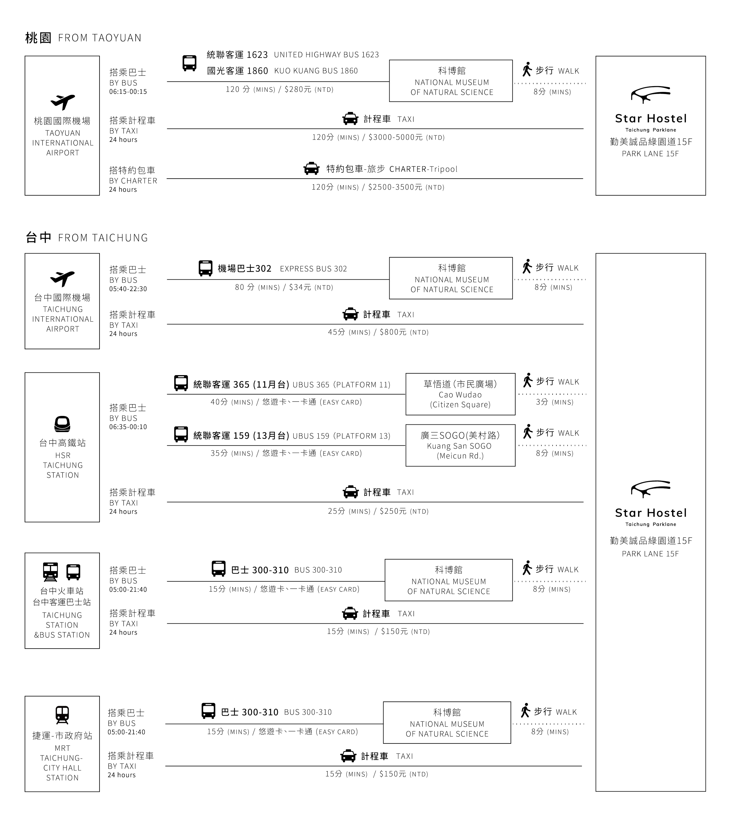 ▾ Take [Bus 302], about 80 mins, and get off at [Taiwan Blvd. BRT – National Museum of Natural Science Station].